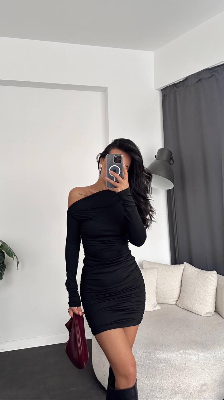 ASİMETRİK YAKA DALGIÇ KUMAŞ UZUN KOLLU MİNİ ELBİSE